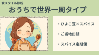 食スタイル診断 【診断結果】おうちで世界一周タイプのあなたへ おうちで世界一周タイプの特徴節約をベースにしつつ、世界各国の料理やお店の味に挑戦し、食の喜びを見つけられる特徴があります。新商品や世界各国の新しい味に挑戦するのに欠かせない調味料は余りがちですが、他の料理にも使える万能調味料やミニサイズや小... 2025.09.15 食スタイル診断